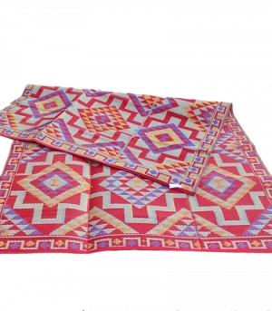 Plastic vloermat met aztec motief, aan de randen afgewerkt met band.